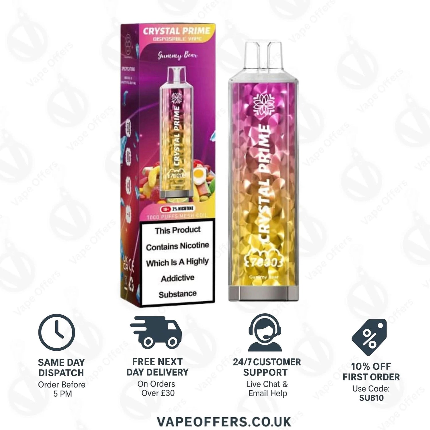 The Crystal Prime 7000 range is renowned for its premium quality, from the sleek 3D light design to its advanced coil technology and long-lasting battery life. The Gummy Bear flavour adds a playful twist, making it a favourite for vapers who enjoy sweet and fruity profiles. Plus, with a 15ml e-liquid capacity and up to 7000 puffs, you can enjoy your vape for longer without the need for constant replacements.