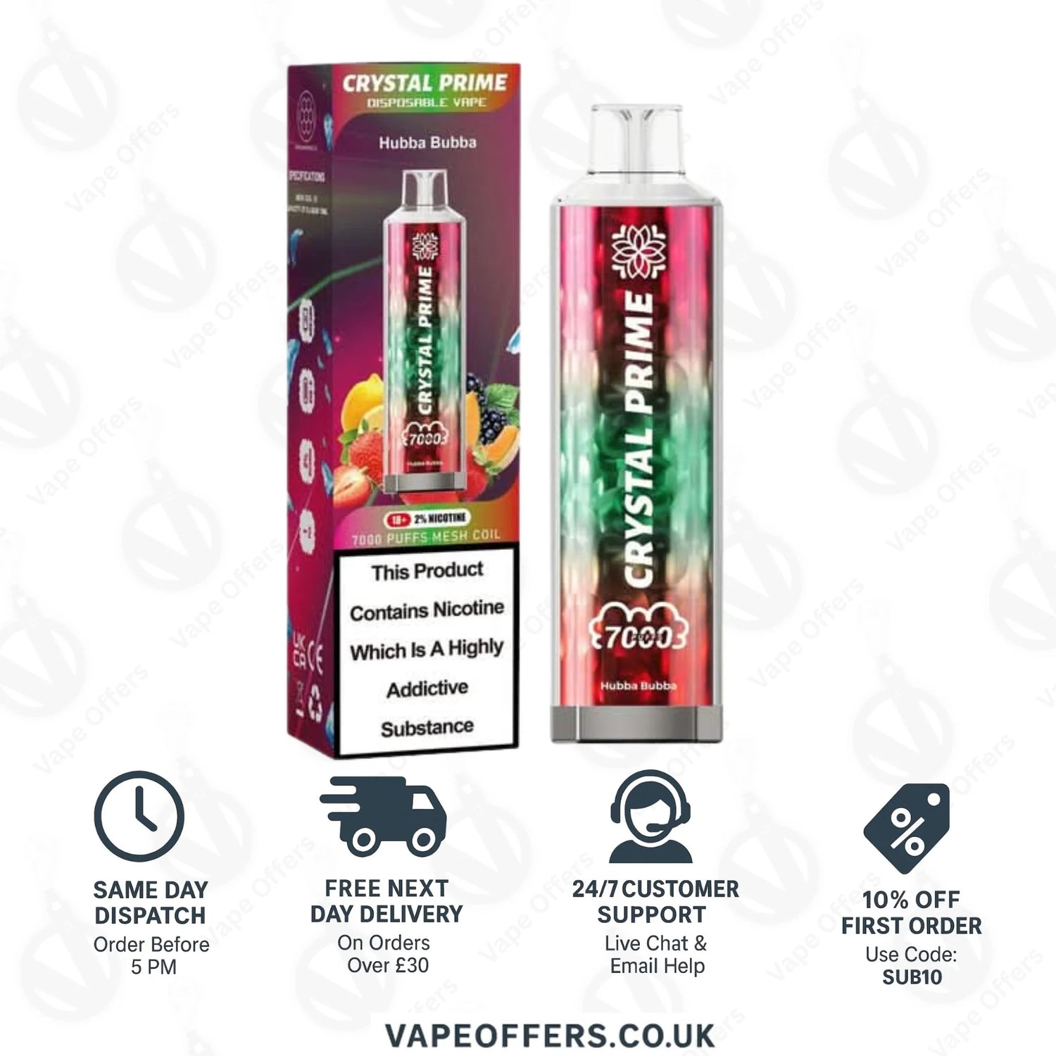 What sets the "Hubba Bubba 3D Crystal Prime 7000 Vape" apart is its captivating multi-shaded crystal 3D effect, adding a touch of nostalgia and sophistication to your vaping experience. Whether you're unwinding at home or on the move, this device is sure to turn heads and ignite conversations.