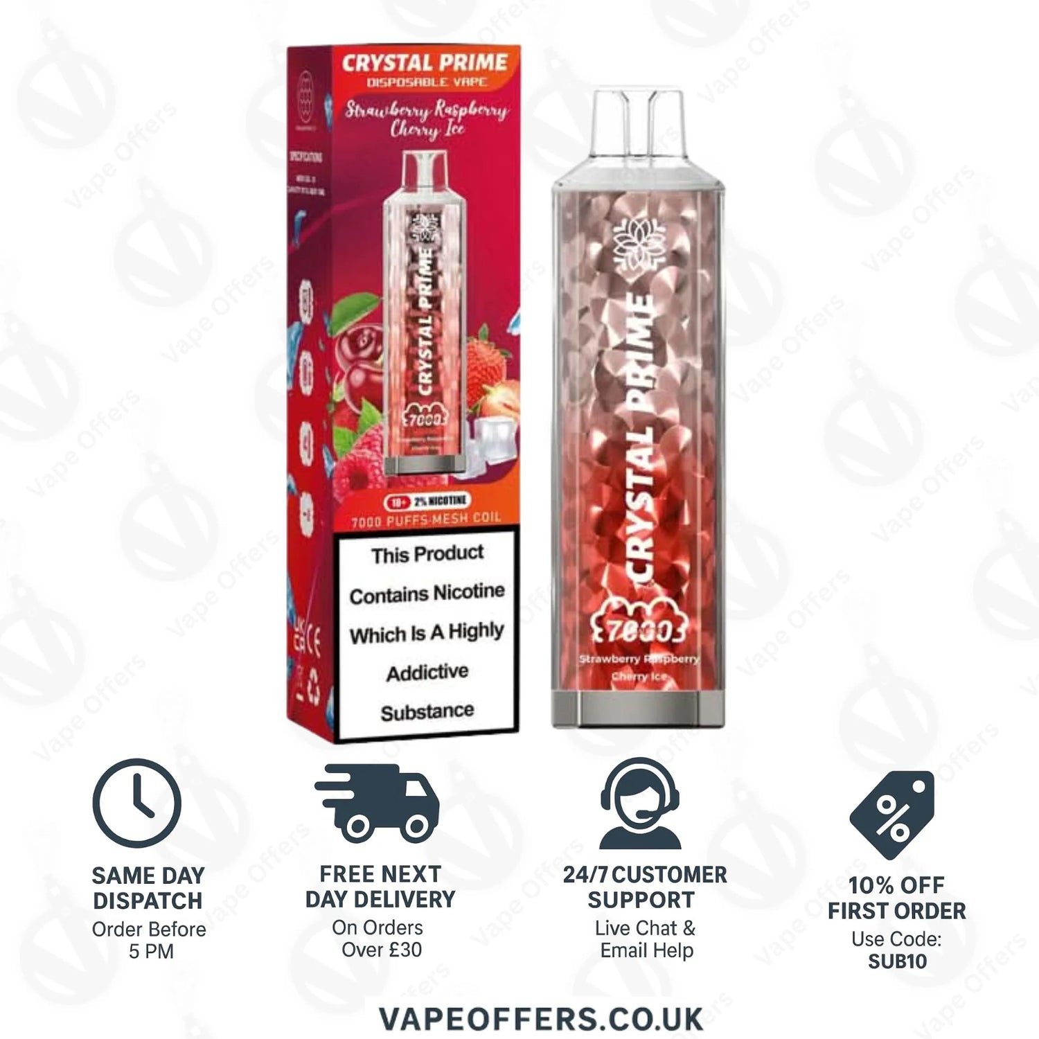 What sets the "Strawberry Raspberry Cherry Ice 3D Crystal Prime 7000 Vape" apart is its captivating multi-shaded crystal 3D effect, adding a touch of elegance and sophistication to your vaping experience. Whether you're unwinding at home or on the move, this device is sure to turn heads and ignite conversations.