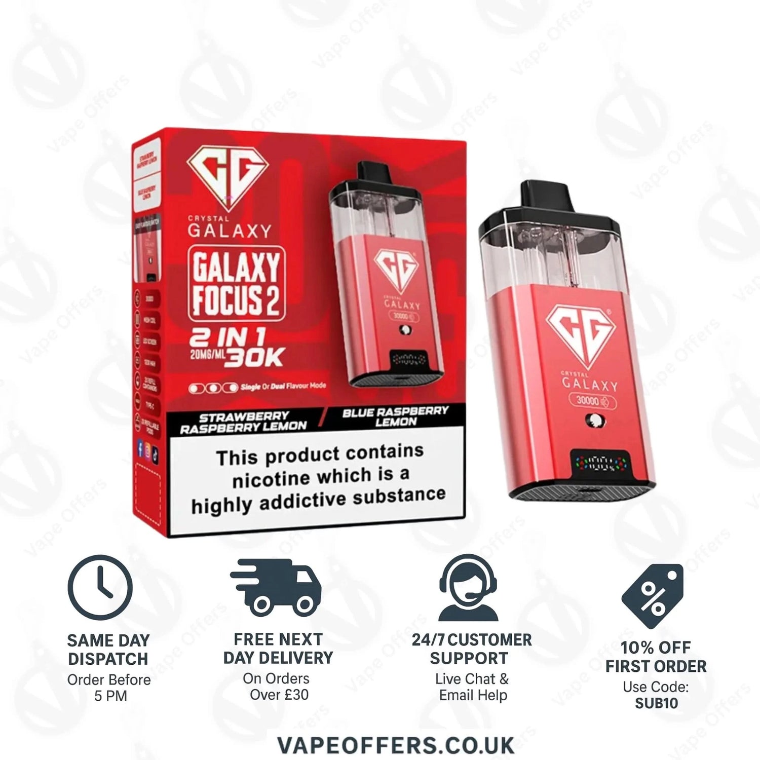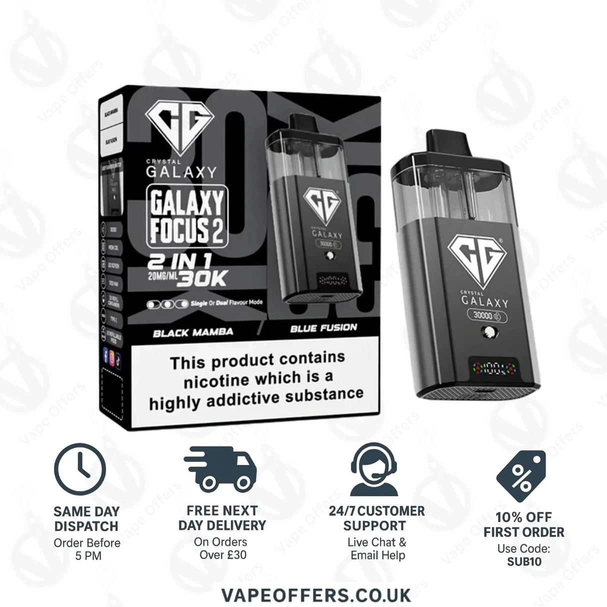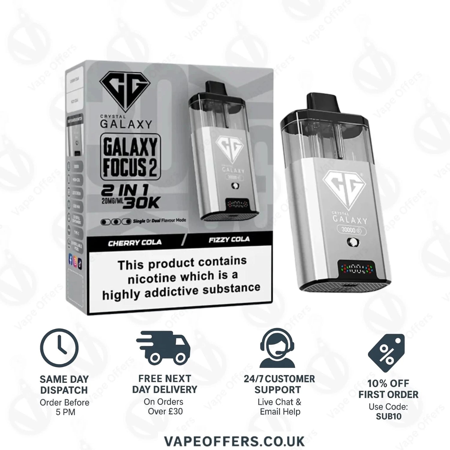 Fully TPD-compliant and backed by Vape Offers’ reliable service, the Galaxy Focus 2 is ideal for everyday use. Replacement Galaxy 30K pods are available, and if you're just getting started, our Vaping Guide will help you find your ideal style. Enjoy fast UK delivery, exclusive offers, and quality you can trust.