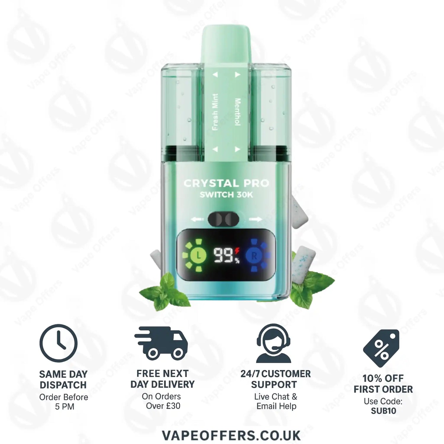 With a wide array of flavours to choose from, the Crystal Pro Switch 30K caters to every palate. From fruity blends like Strawberry Kiwi to refreshing options like Fresh Mint, there's something for everyone. Its compact design and long-lasting performance make it a top choice for vapers in the UK.