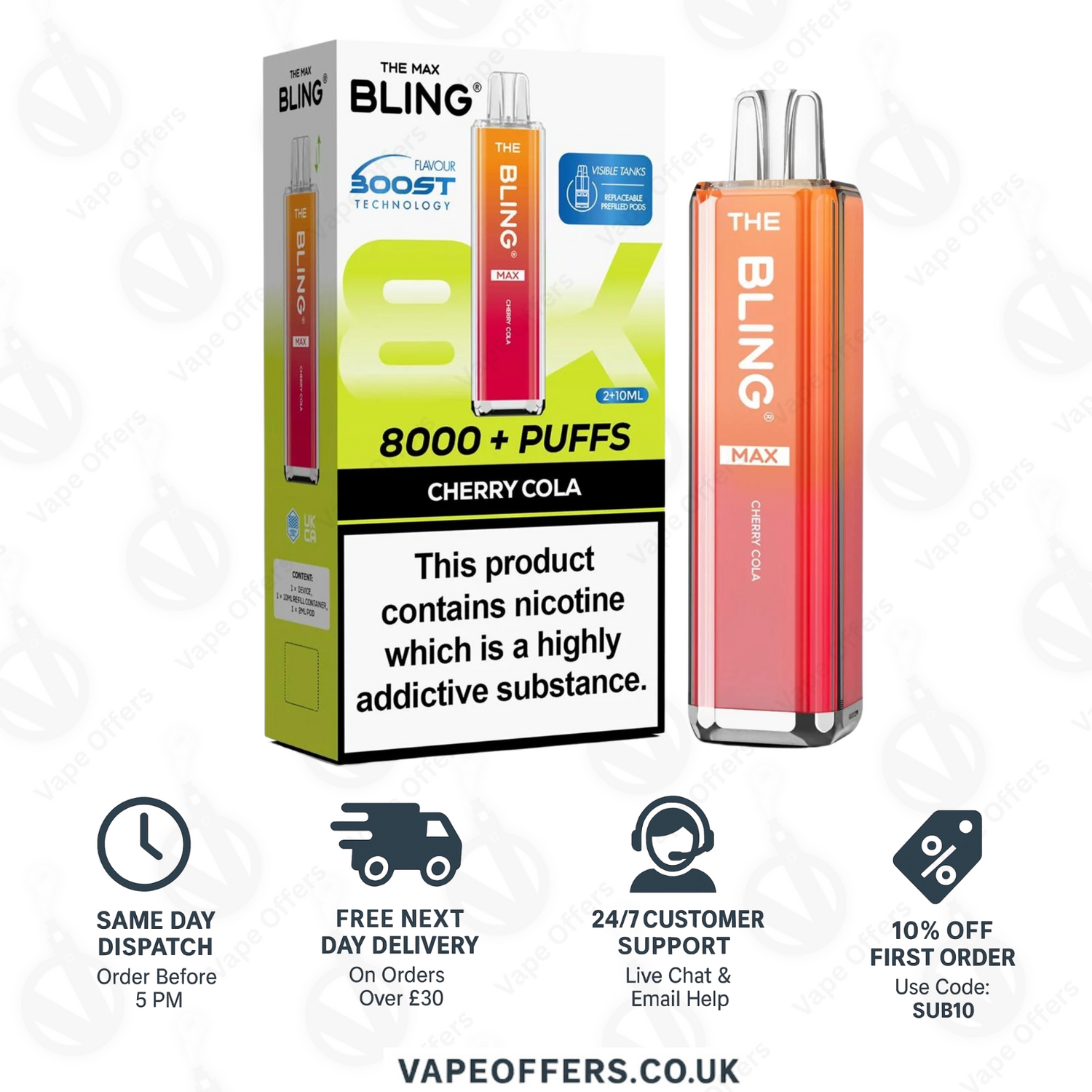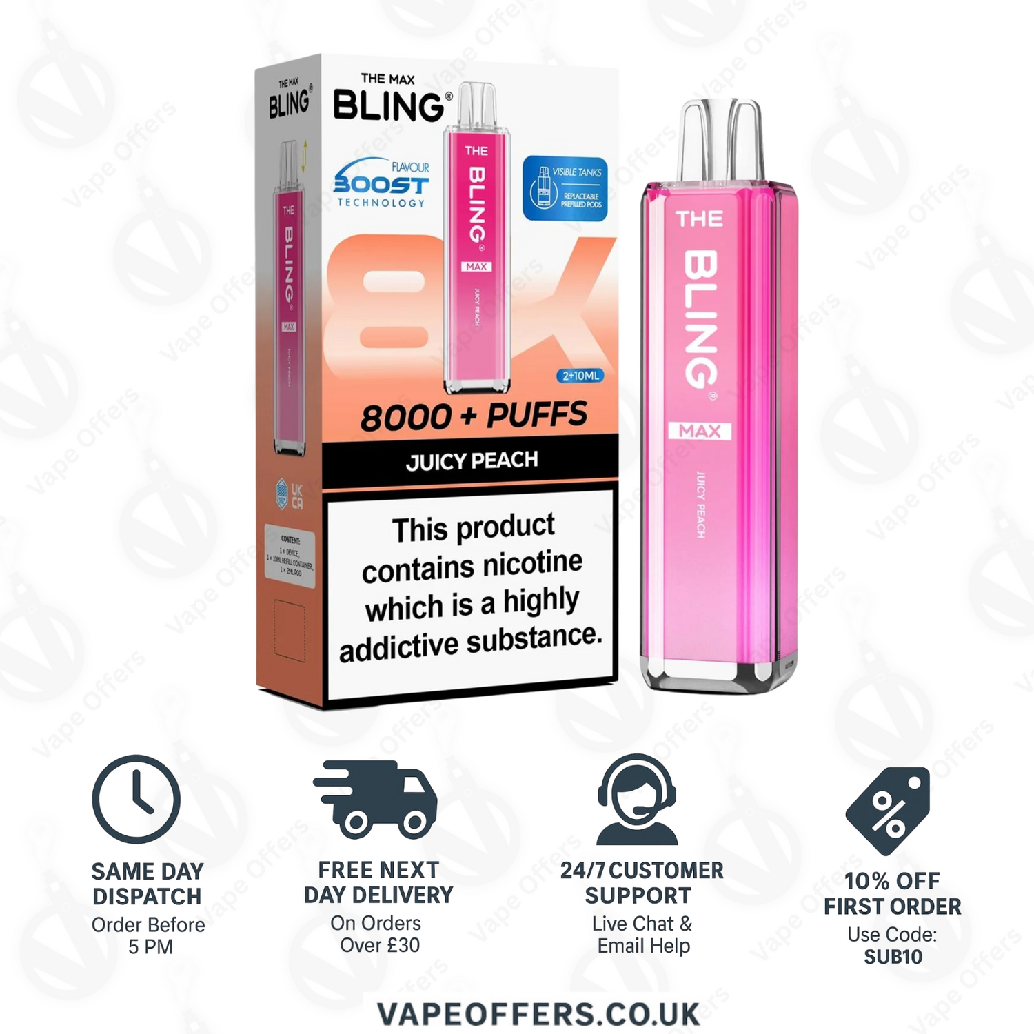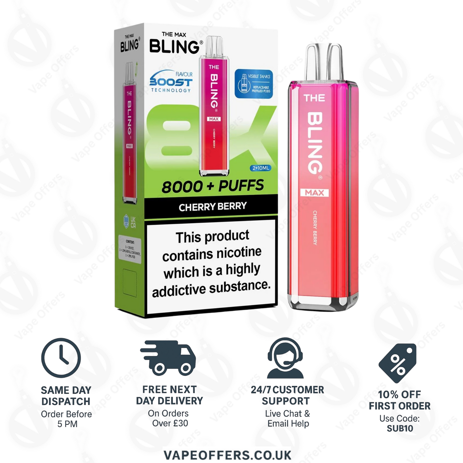 Vapers prefer the Crystal Bling Max 8000 because it blends style with substance. It offers a larger e-liquid capacity (two 10ml pods) and higher puff count than most Vapes, meaning fewer replacements and better value. The premium mesh-coil system delivers consistently bold, smooth flavour, which many users find more satisfying than basic bar vapes. With its fast USB‑C charging and durable battery, it outlasts many simpler devices. All this comes wrapped in a sleek, lightweight body – a combination of form and function that keeps customers coming back. In practice, users praise it as “extremely tasty” and a great value, often choosing it over other vapes for these advantages.