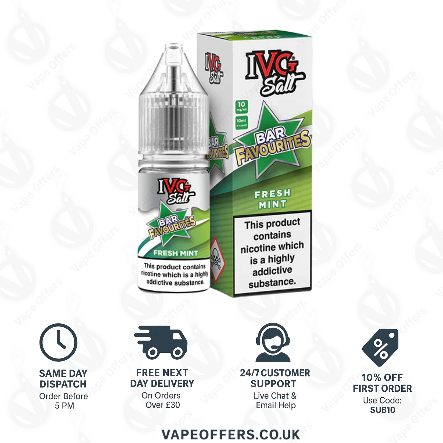 Discover the refreshing allure of IVG Bar Favourites Fresh Mint Salts. This exceptional e-liquid blend offers a pure and invigorating vaping experience with its cool and crisp minty flavor. With each inhale, feel the icy freshness as the minty notes awaken your senses, providing a revitalizing burst that soothes and uplifts. The clean and refreshing taste of fresh mint leaves a lingering coolness on your palate, creating a truly satisfying sensation. Crafted with expertise, the salts formulation ensures a smooth and satisfying throat hit, allowing you to fully enjoy the rejuvenating properties of mint. Let IVG - Bar Favourites Fresh Mint Salts transport you to a world of pure minty bliss, where every puff envelops you in a refreshing cloud of cool mint and leaves you feeling invigorated. Elevate your vaping experience with the crispness of IVG - Bar Favourites Fresh Mint Salts