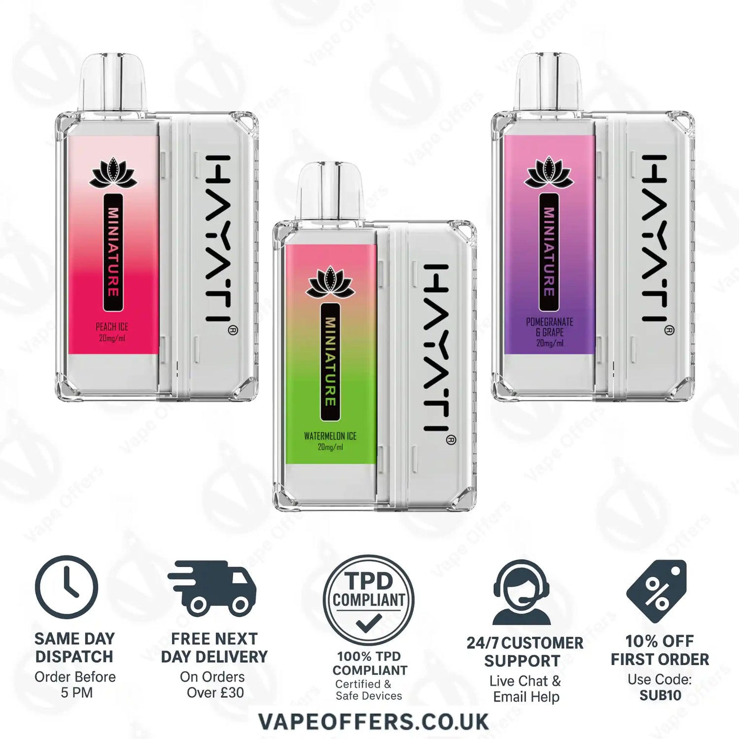 The Hayati Miniature 600 is available at Vape Offers UK, with free next-day delivery on orders over £30 and competitive pricing.