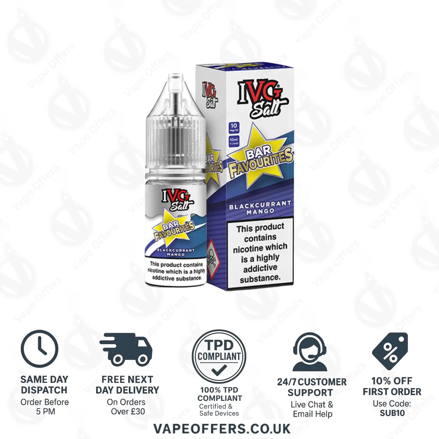 Discover the perfect harmony of flavors with IVG Bar Favourites Blackcurrant Mango Salts. This exceptional e-liquid blend combines the bold richness of blackcurrants with the exotic sweetness of ripe mangoes, creating a vaping experience that will transport you to a tropical paradise. With each inhale, succumb to the enticing tanginess of blackcurrants as their deep flavors dance on your palate, while the luscious mango undertones add a tropical twist. Crafted with expertise, the salts formulation ensures a smooth and satisfying throat hit, allowing you to fully savor the remarkable combination of flavors. Indulge in the fusion of classic favorites with a tropical twist, as IVG - Bar Favourites Blackcurrant Mango Salts takes your taste buds on a tantalizing journey that is both familiar and exotic.