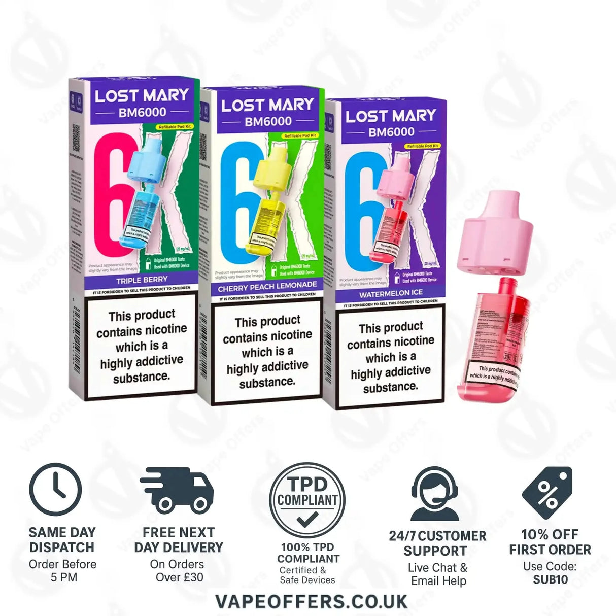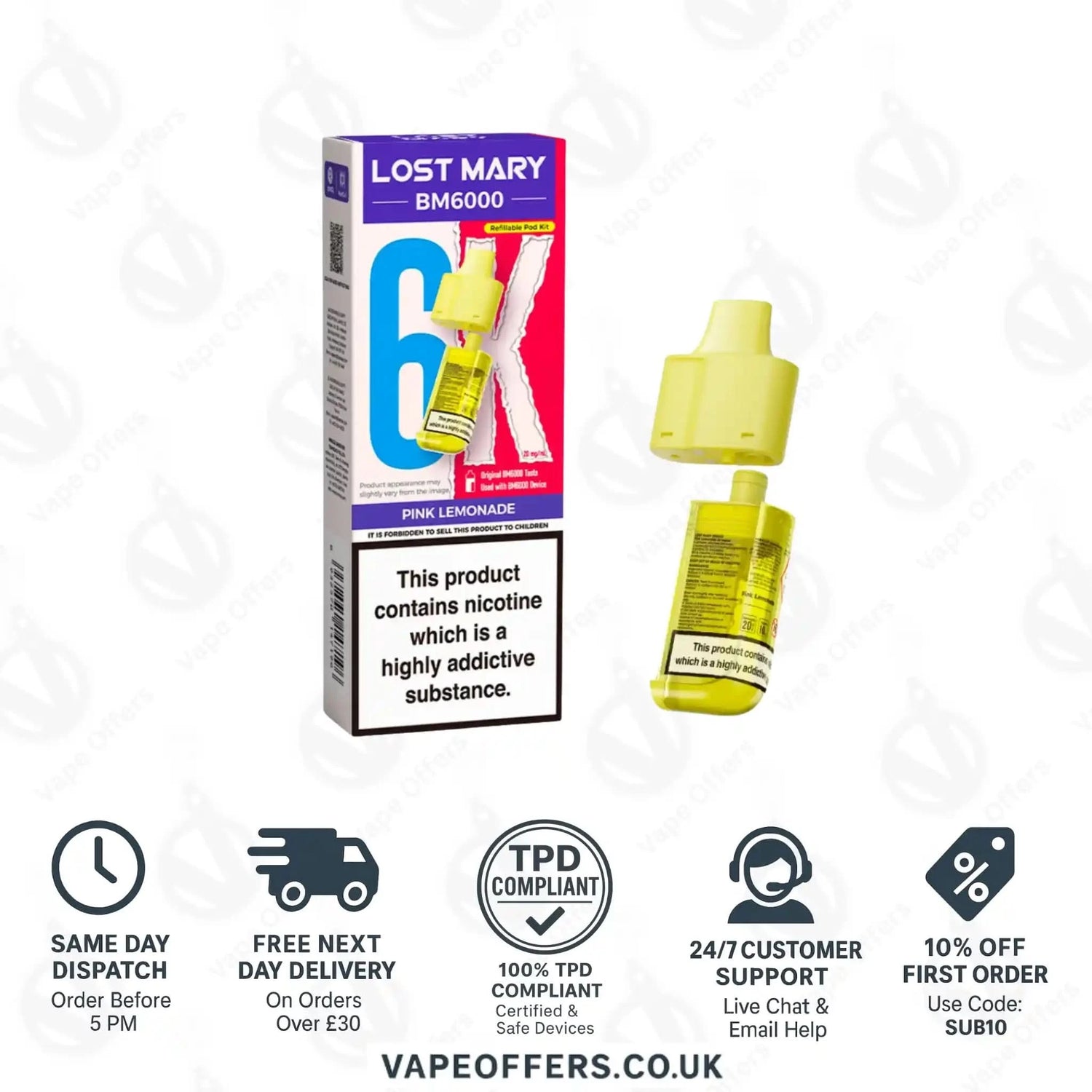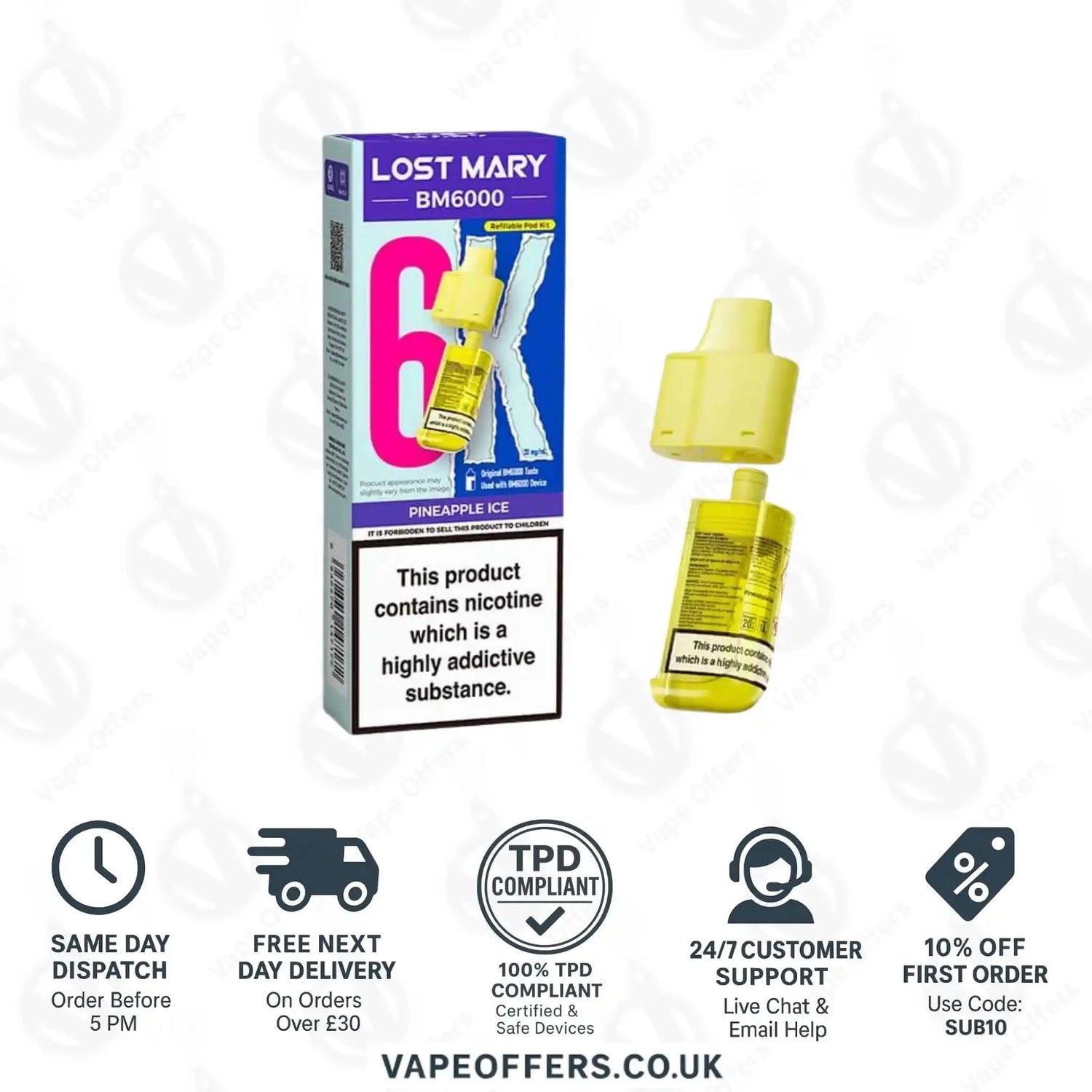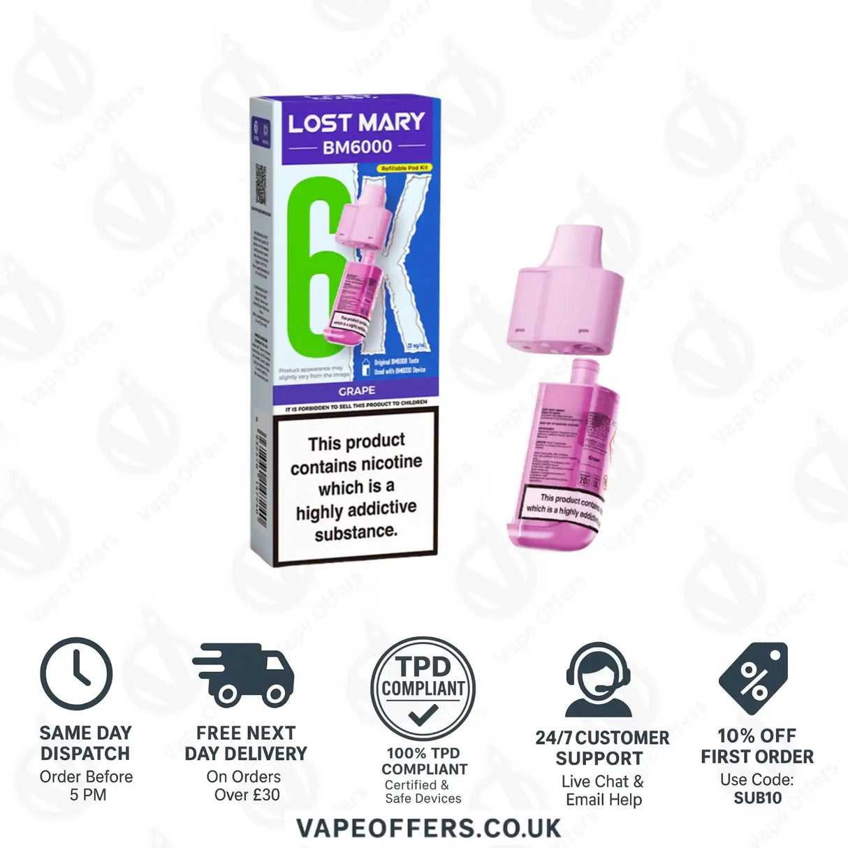 The Lost Mary BM6000 Prefilled Pods are rated for up to 6000 puffs with the BM6000 Kit, offering excellent value compared to disposables.