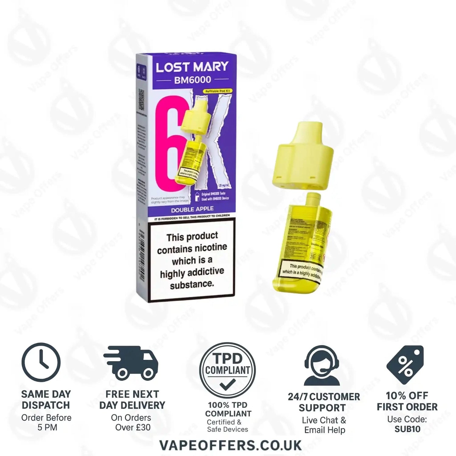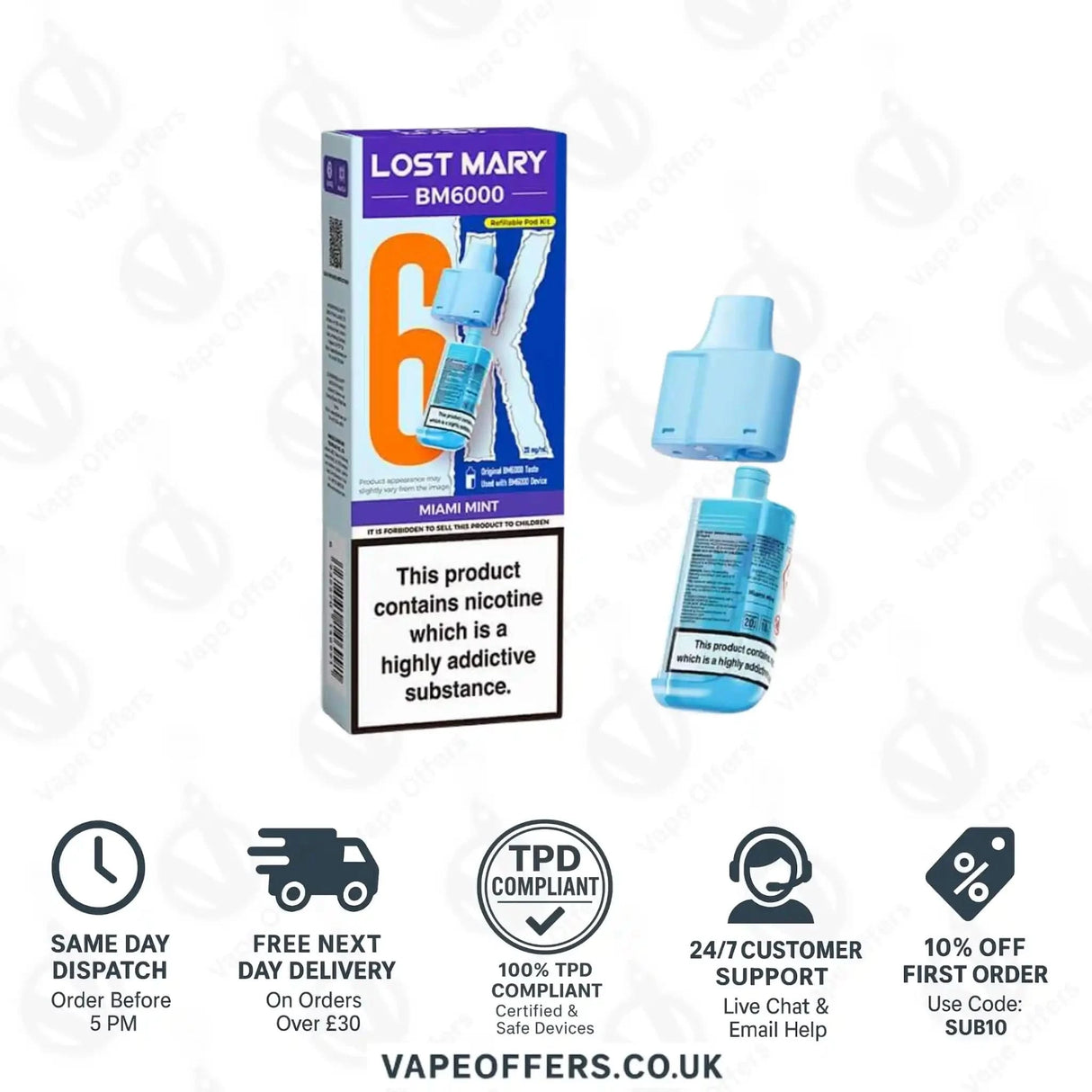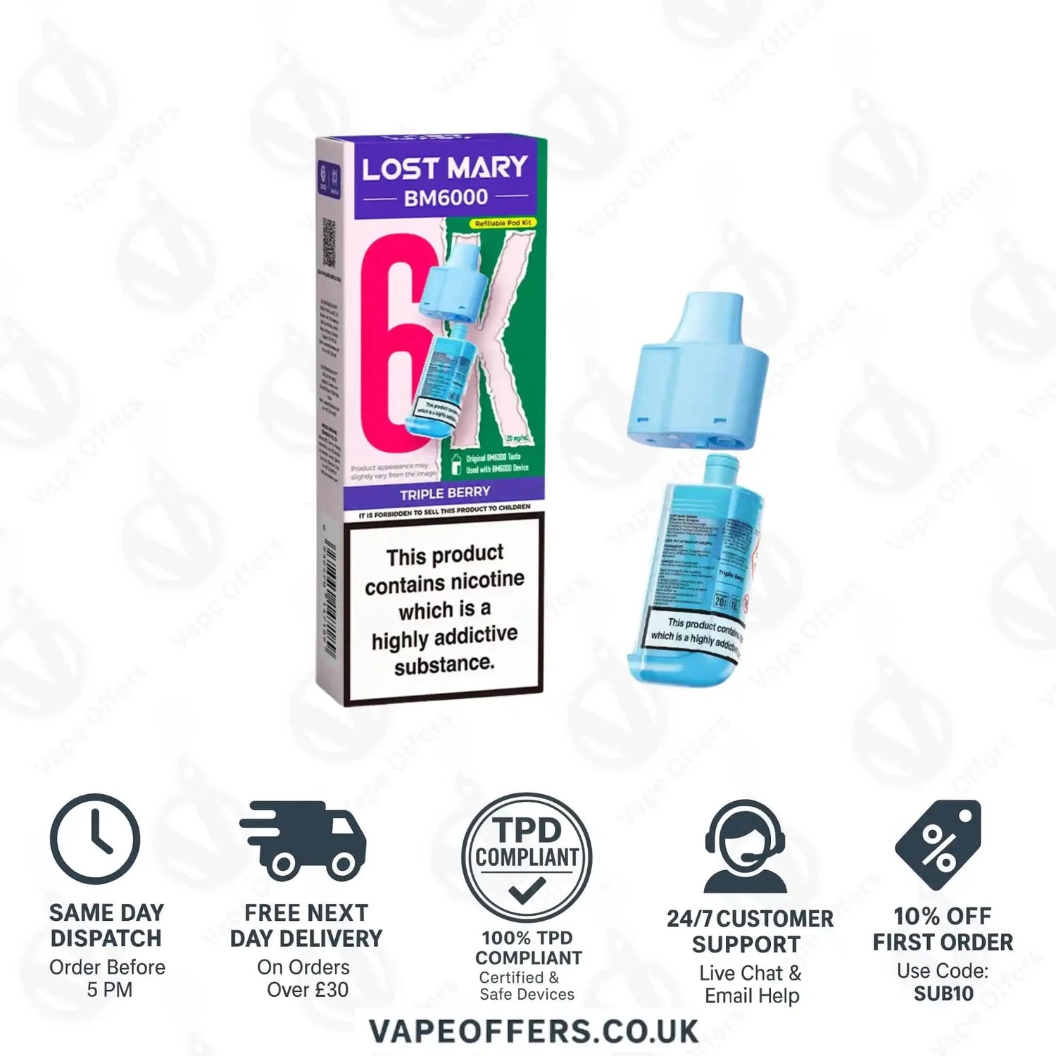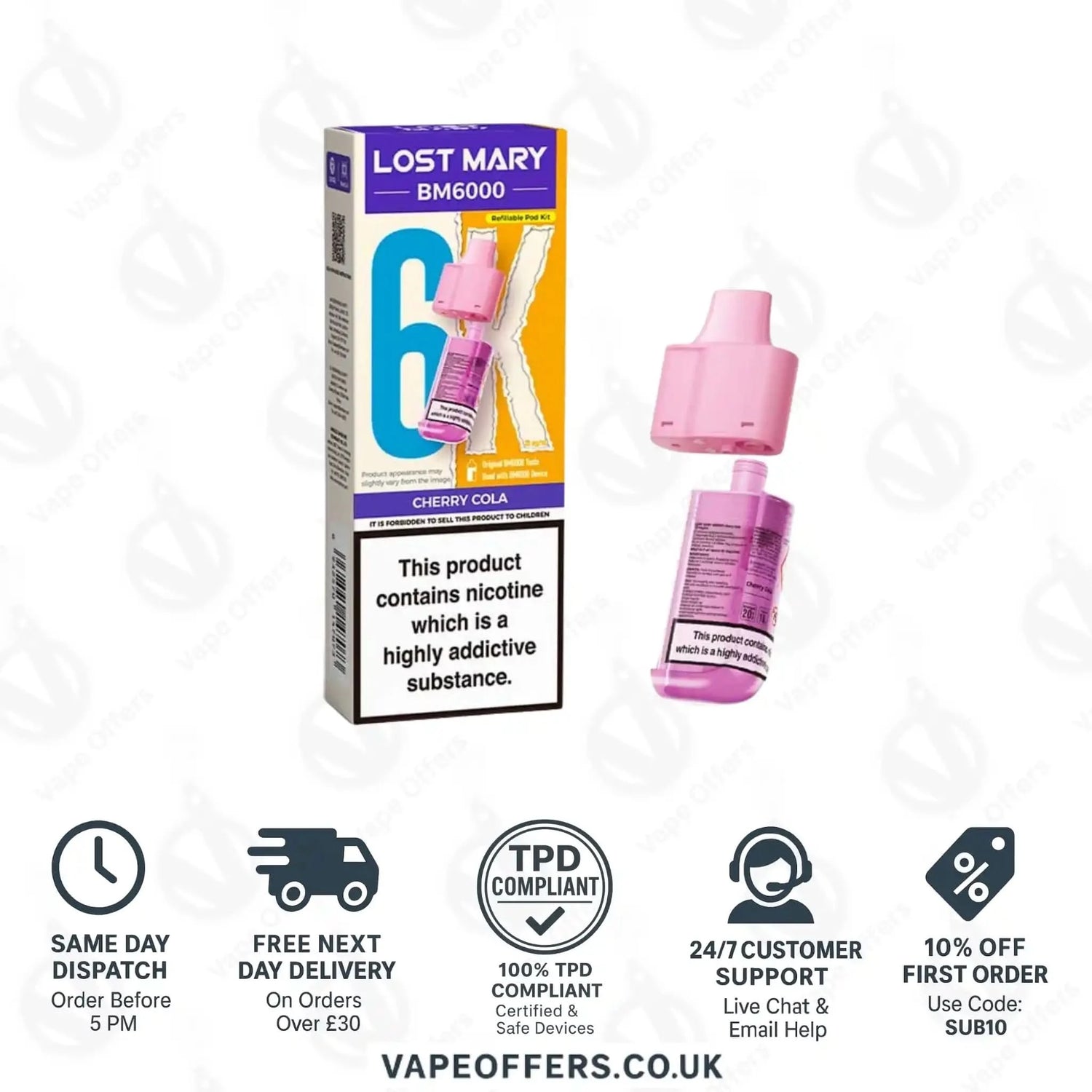 The Lost Mary BM6000 Prefilled Pods are rated for up to 6000 puffs with the BM6000 Kit, offering excellent value compared to disposables.